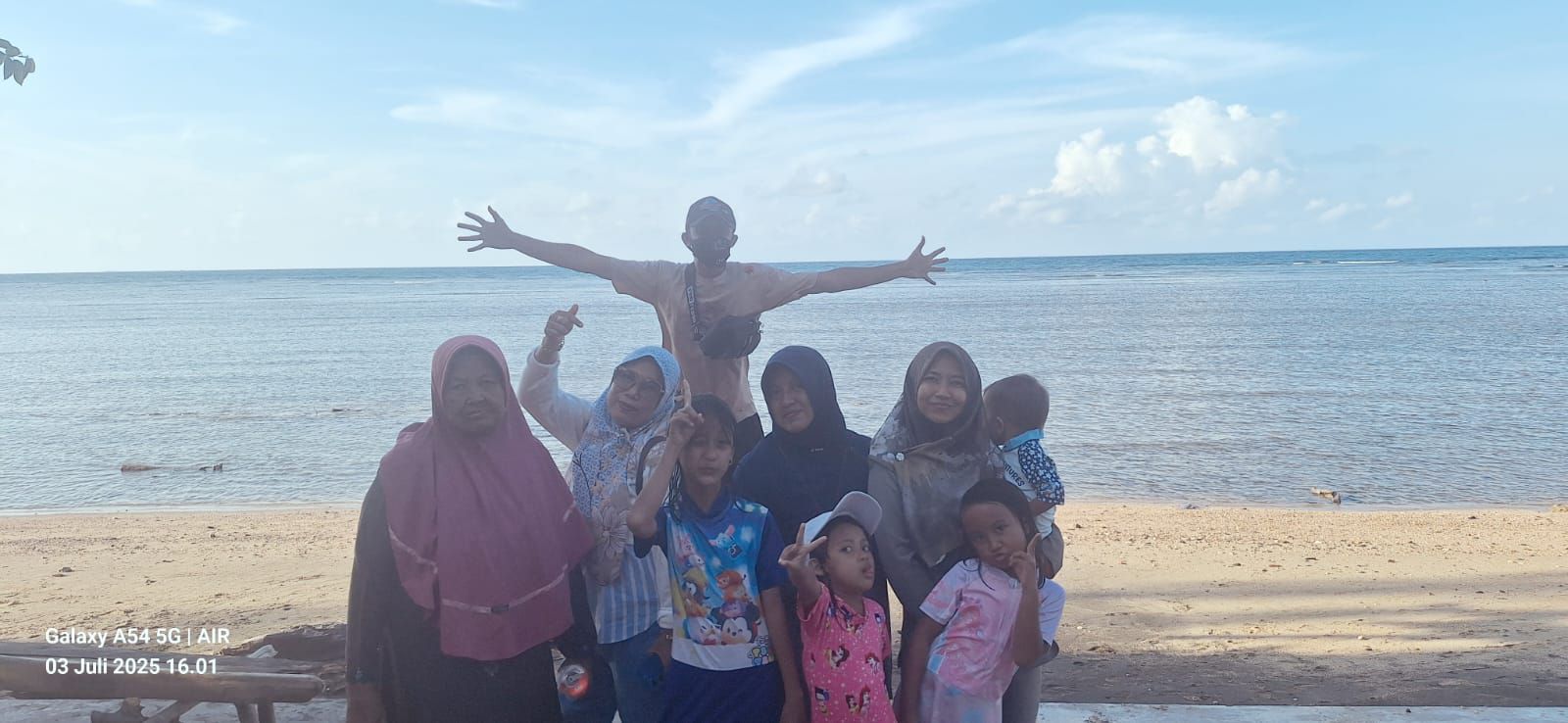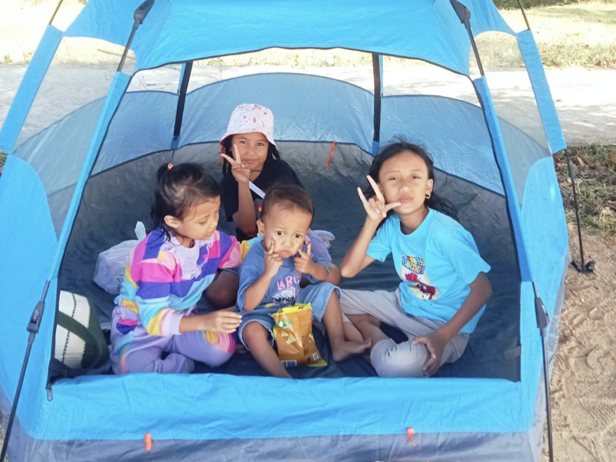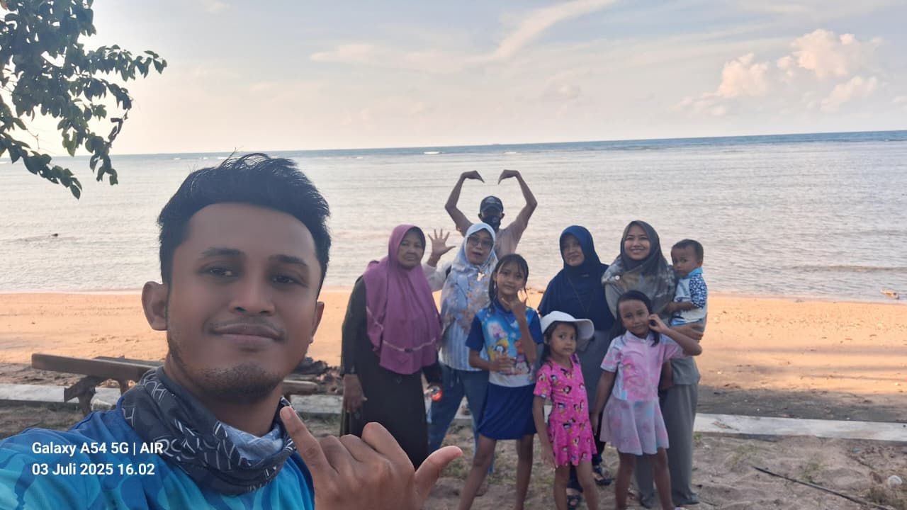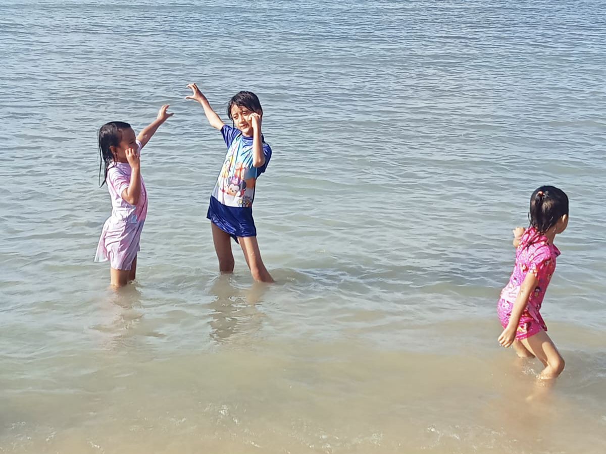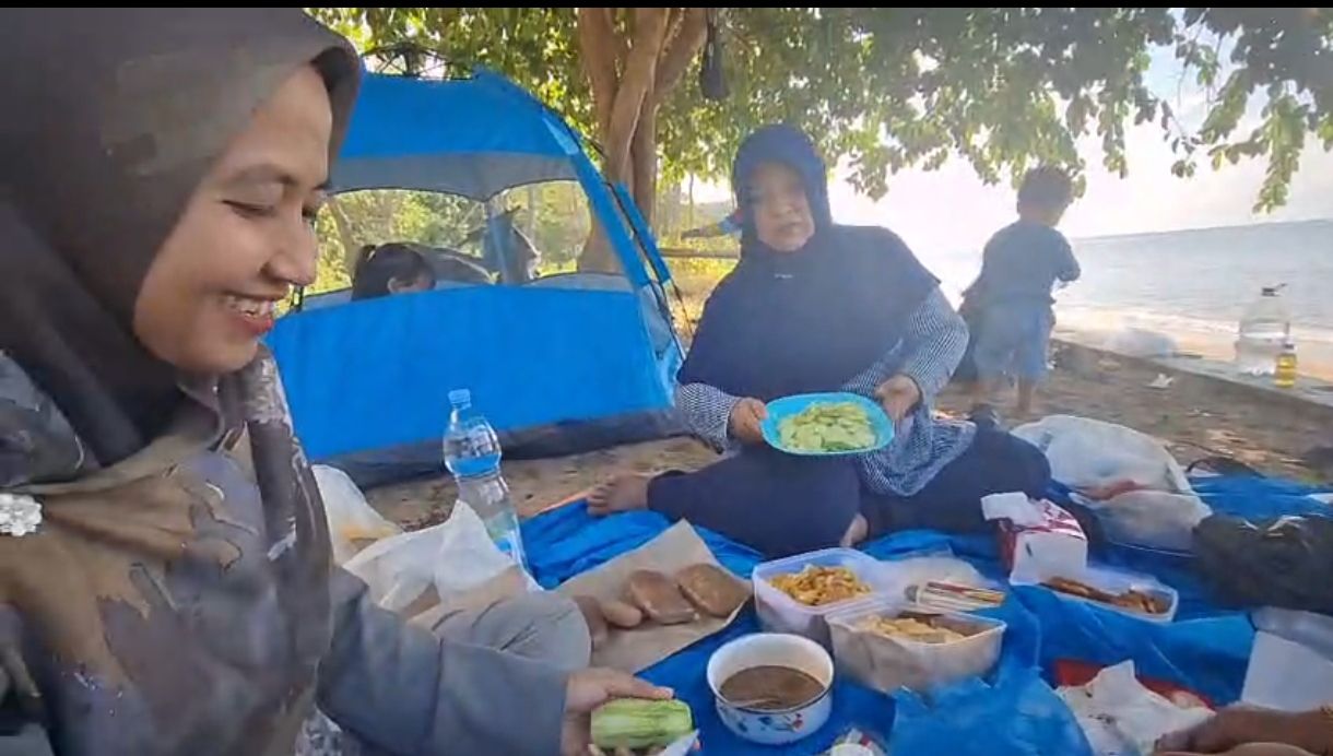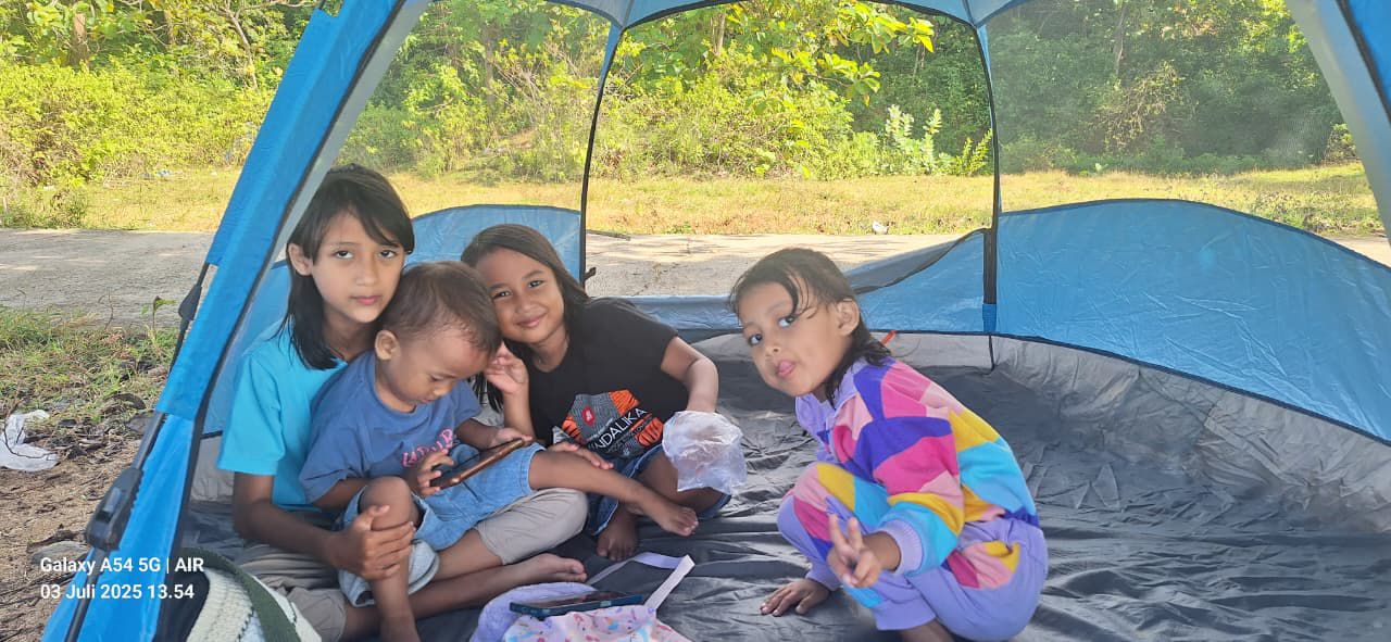 Sesampainya di sana dengan sigap, kami mendirikan tenda di atas pasir putih yang lembut, yang langsung menjadi markas utama kami. Tawa riang keponakan-keponakanku Zira, Shebi dan Azza yang cantik, serta Saga yang lucu dan ganteng menjadi musik terindah siang itu. Mereka berlarian, bermain pasir, dan saling kejar dengan ombak kecil di bibir pantai. Melihat energi mereka yang seolah tak ada habisnya, membuat kami yang dewasa ikut tersenyum dan bersemangat.